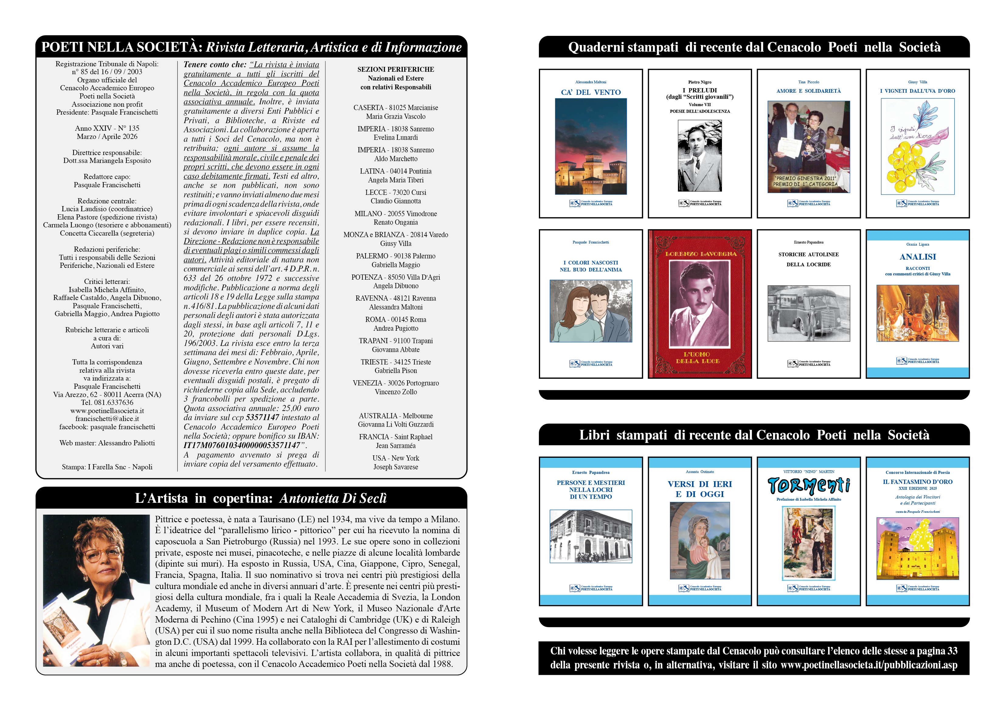 La rivista è inviata gratuitamente a tutti gli iscritti del Cenacolo Accademico Europeo Poeti nella Società, in regola con la quota associativa annuale.